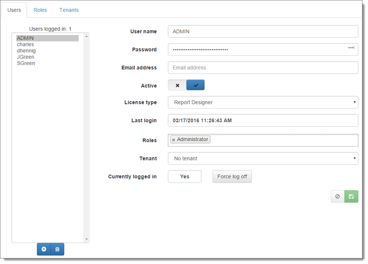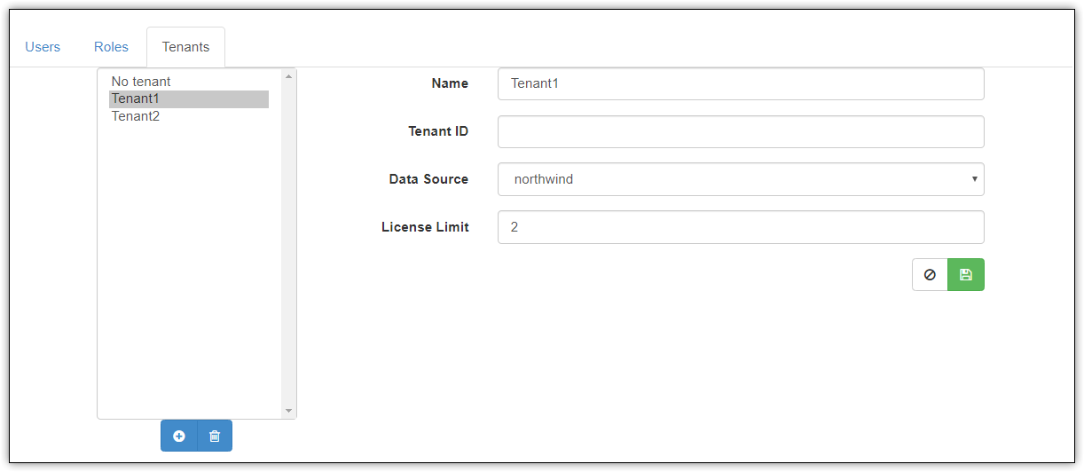 Tenant the tenant the user belongs to. Select the desired tenant from the drop-down list of tenants or No tenant if the user doesn’t belong to any tenant (usually only the ADMIN user).