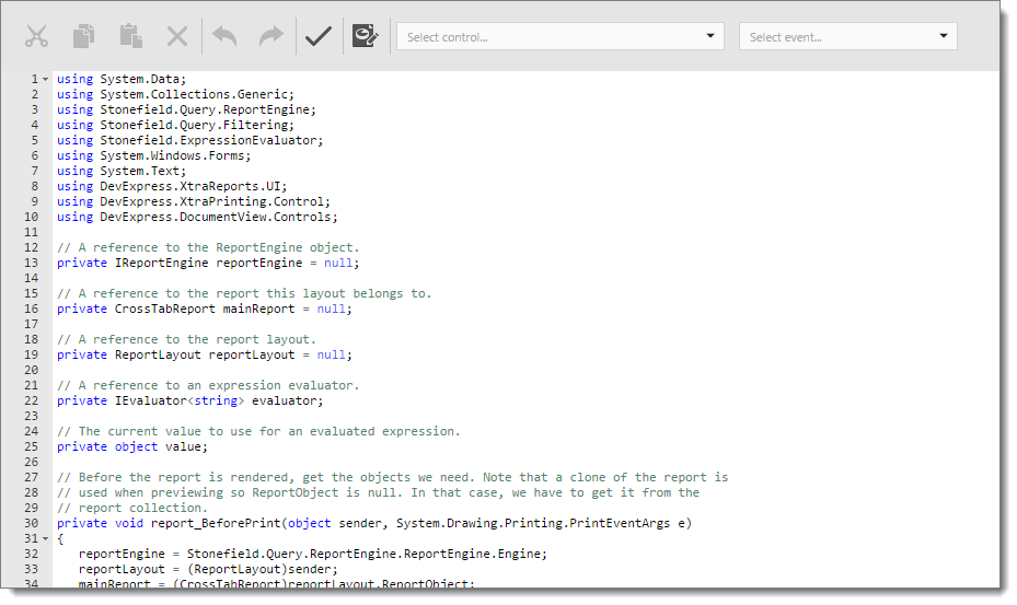 The Control drop-down list in the toolbar lists the objects in the report. The Event drop-down list beside the Control list displays the events for the selected object. Choosing one from the list either creates a script to handle that event or moves the editor to that script if it already exists.