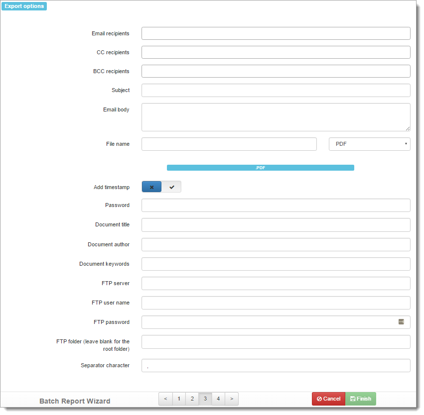 Note that when a batch report is previewed, it will be exported to the specified file type. If you’d like to email or upload (FTP) the report instead, create a schedule for the batch report.