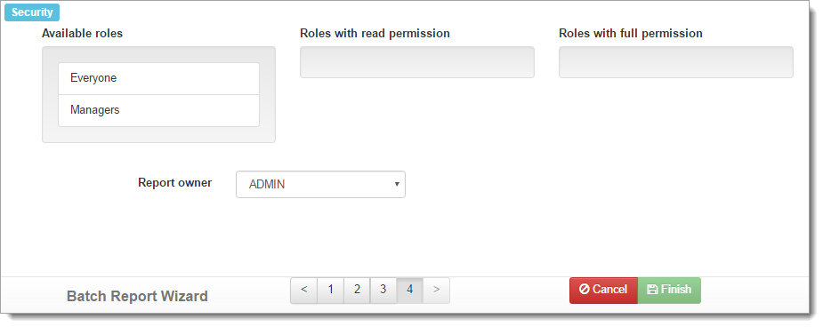 To specify that members of a role can run but not edit or delete the report, drag the role from the Available roles list to the Roles with read permission list. To specify that members of a role can run, edit, or delete the report, drag the role from the Available roles list to the Roles with full permission list. To remove permissions for a role, drag it back to the Available roles list; members of that role cannot see or run the report. The Administrator role doesn’t appear in any list because members of that role have full permission to all reports.