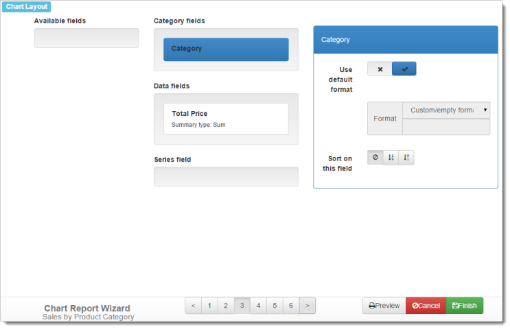 A category field appears in the category, or X, axis of most types of charts. For others, such as pie charts, a category field is used for something else, like the slices of a pie. For example, to show a chart of sales by product by year, use the product name as the category field.