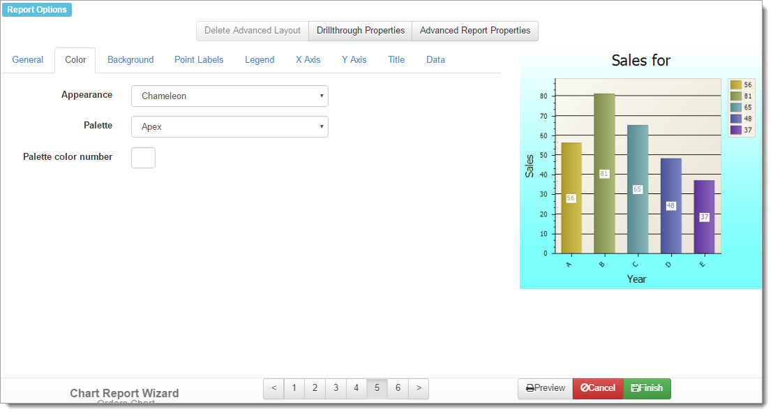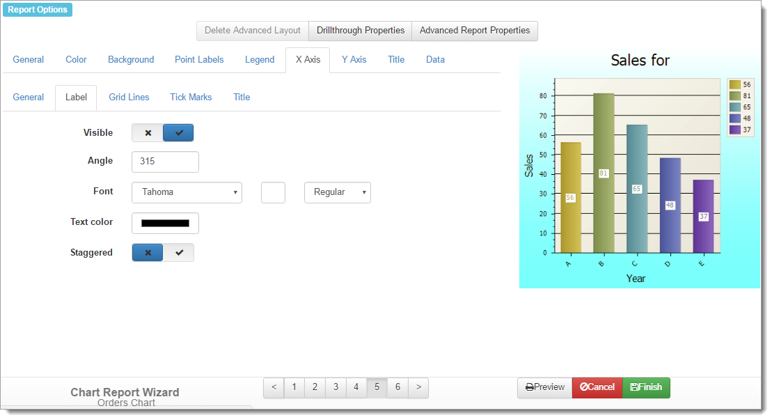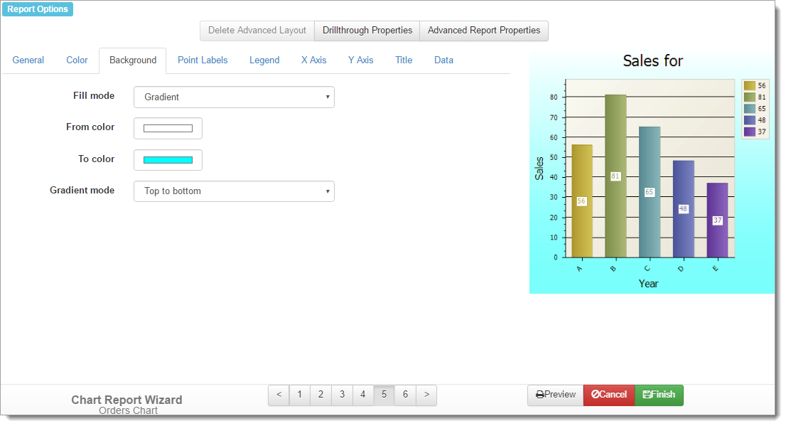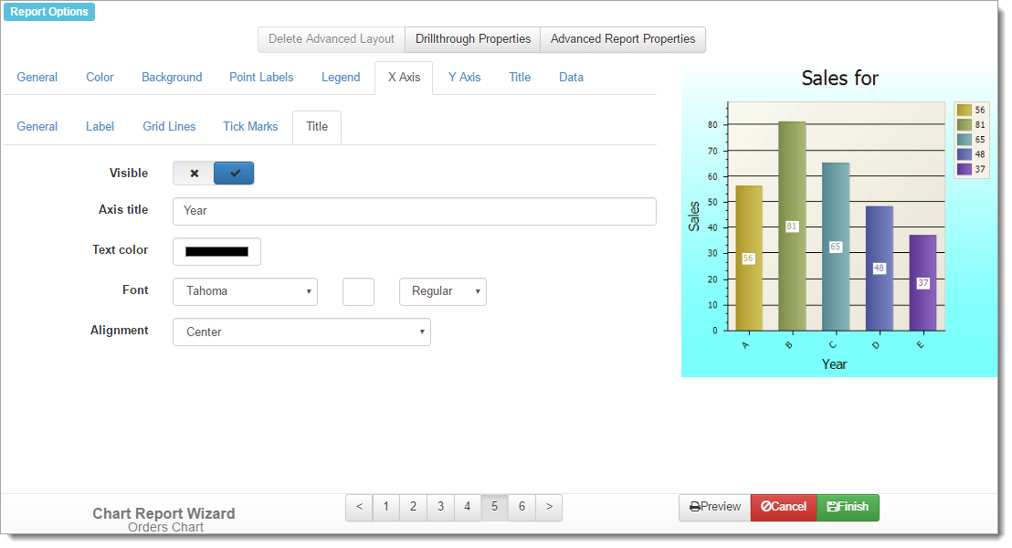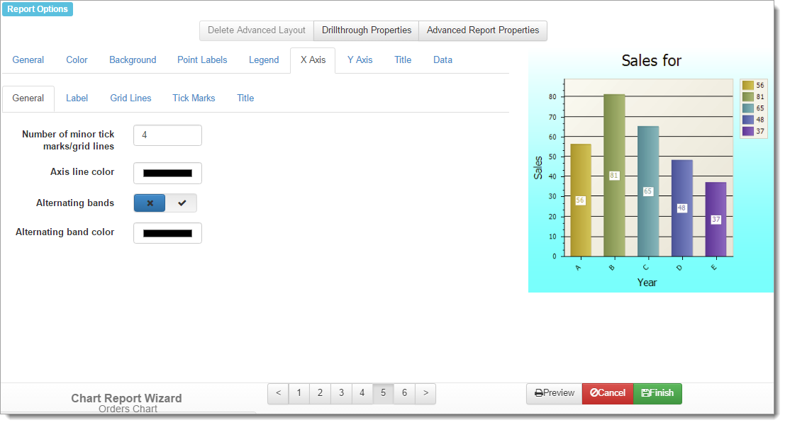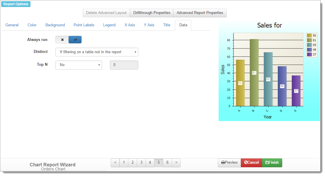 As you make changes to the various options in this step, the sample chart displayed in this step automatically adjusts to show you what the chart looks like using your settings. However, it does not show actual data from your database; to do that, click the Preview button.