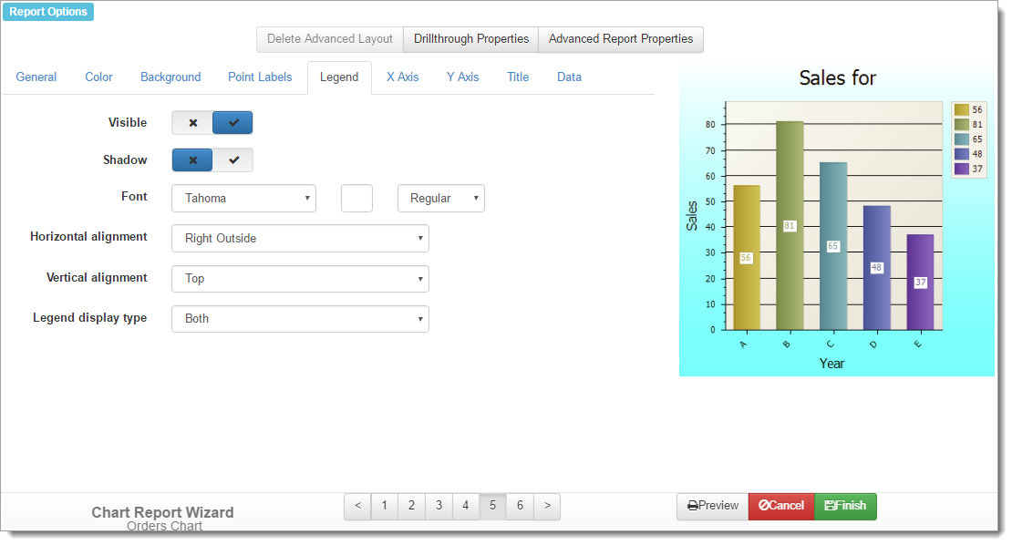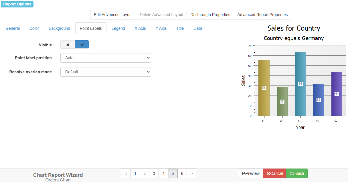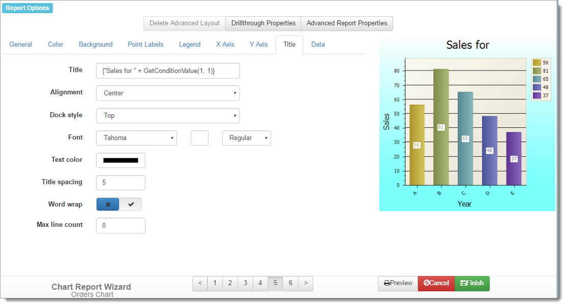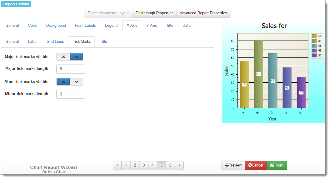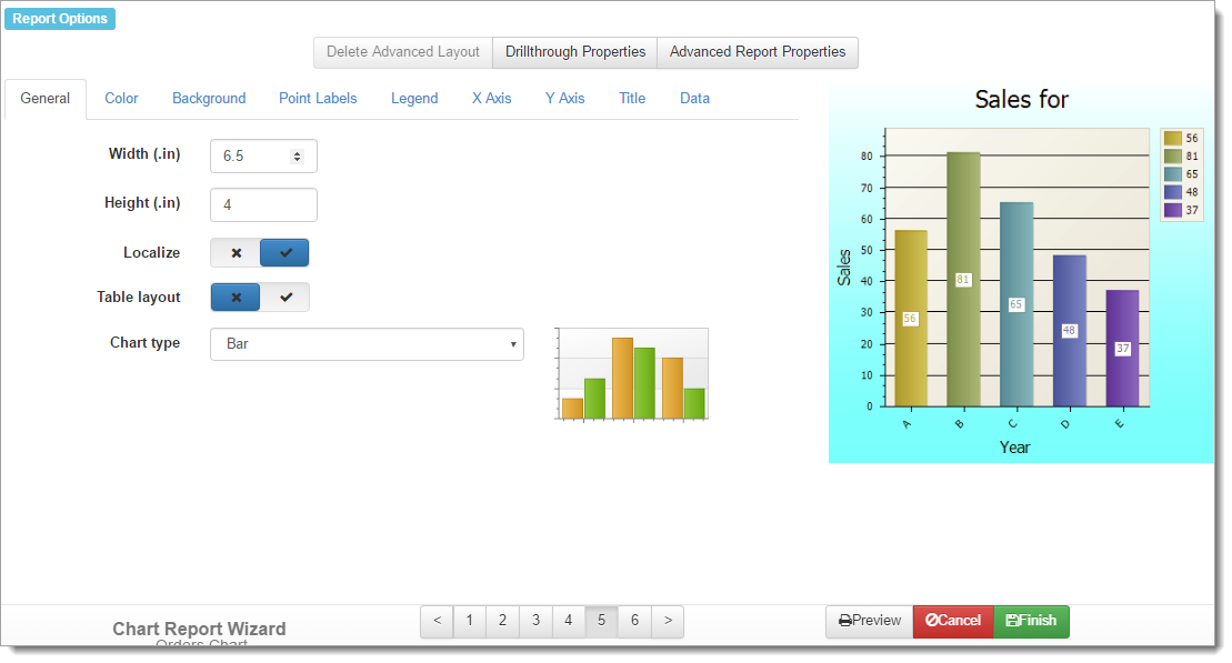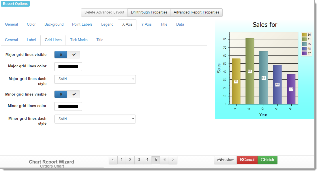 As you make changes to the various options in this step, the sample chart displayed in this step automatically adjusts to show you what the chart looks like using your settings. However, it does not show actual data from your database; to do that, click the Preview button.