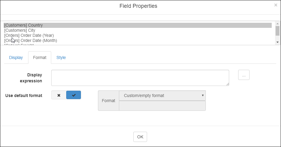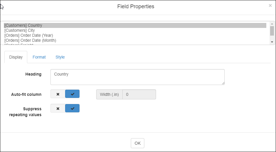 At the top of the dialog is a list of the selected fields in the report. Choose the desired field to edit its properties.