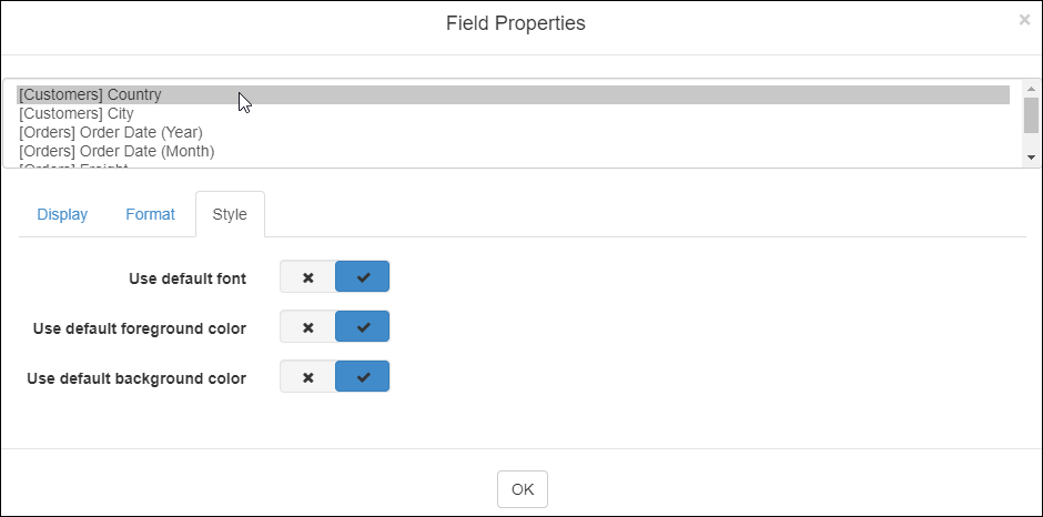 Use default background color: if this option is turned on, which it is by default, this field uses the background color specified in the template for the report, even if the color is changed after the field is added to the report. To change the color, turn this option off and choose the desired color by clicking the color bar and choosing from the Color dialog.