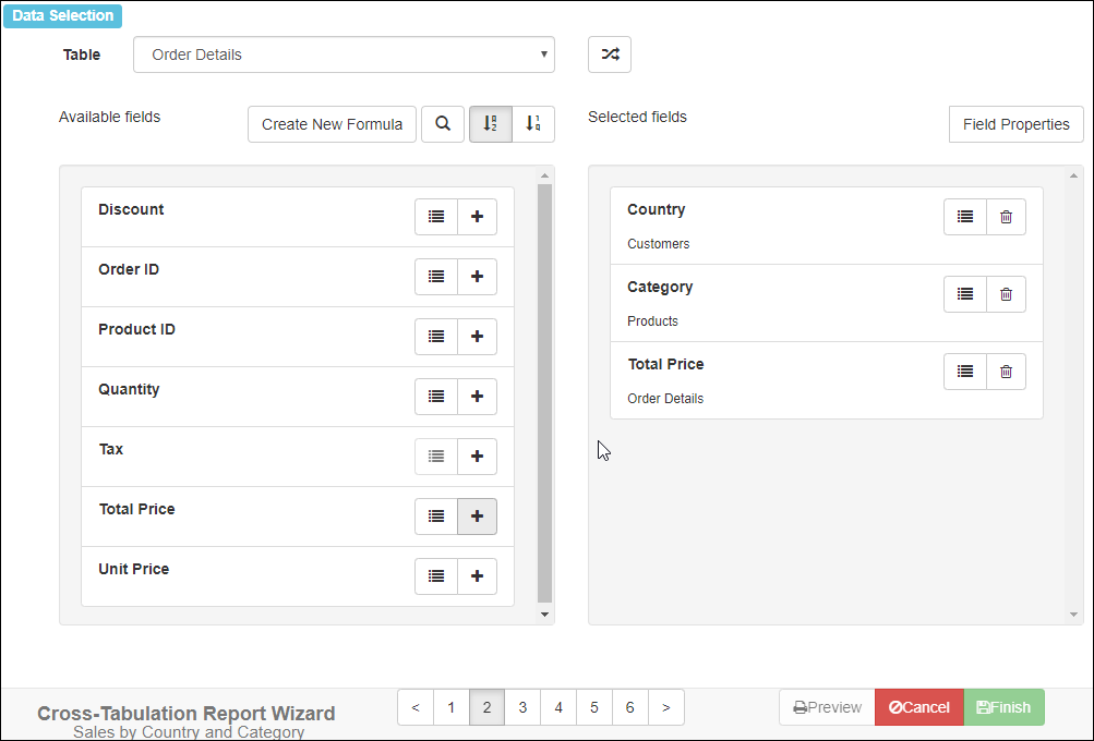 The Available fields list shows the fields for the table selected in the Table drop-down list. You can choose fields from more than one table for a report; simply choose the desired table, add the fields you want from that table to the report, then select another table and do the same. Fields that are actually formulas have a suffix of “[Formula].”