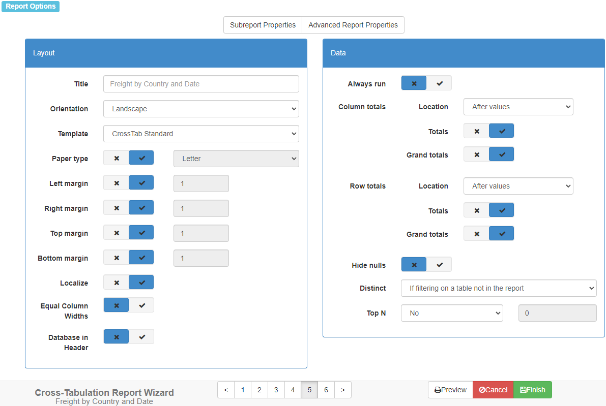 Grand totals: turn this option on, which it is by default, to display row or column grand totals at the end of the report or off to omit them.