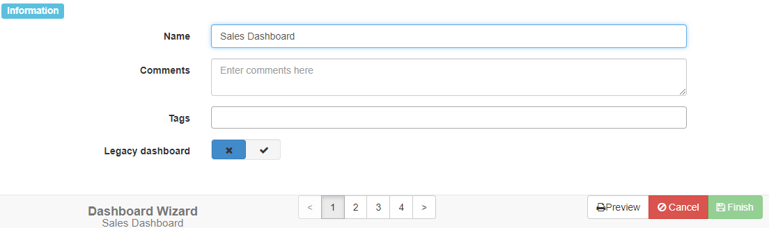 Legacy dashboard: In older versions, a dashboard displayed existing reports with the same layout in a grid. If you wish to use the older style of dashboard, turn this option on.