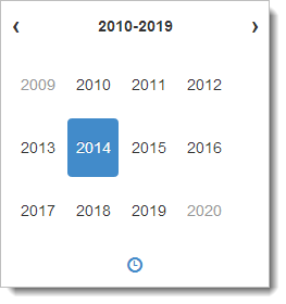 Click the year at the top of the calendar to display a list of years in the selected decade. Clicking a year displays the months for that year. Click the left or right arrows to move to the previous or next decade.