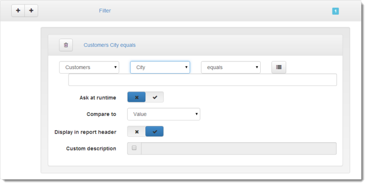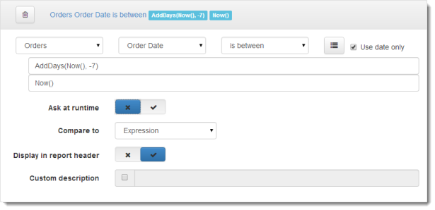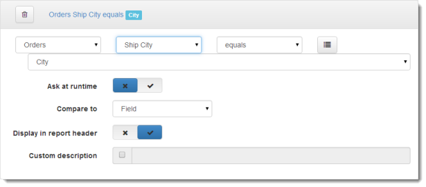 By default, filter conditions are displayed in the header of the report. If you don’t want a particular condition to be displayed, turn off the Display in report header setting. This is useful for reports that have a lot of filter conditions, which can get quite long when listed in the report header. You might in that case turn this option off for all but ask-at-runtime conditions.