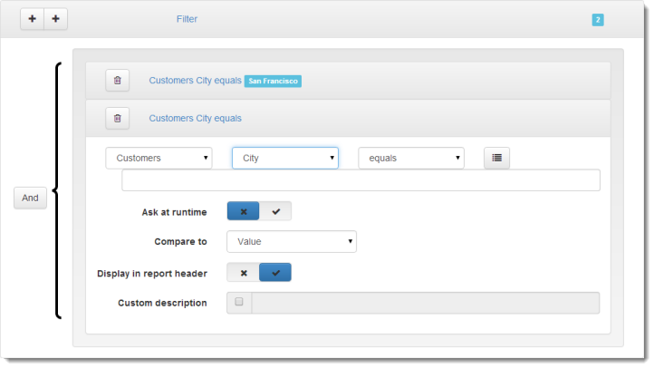 You can think of AND as “more restrictive.” For example, if the first condition is “City equals San Francisco,” that gives a certain set of records. Adding a second condition such as “Order Amount is greater than 100.00” using the AND connection means that for any given record, the city must be San Francisco and the order amount must be greater than $100.00. Since that excludes San Francisco records with an order amount of less than $100.00 (which just specifying the first condition includes), these two conditions together are more restrictive (there are fewer records in the report) than either of these conditions alone.