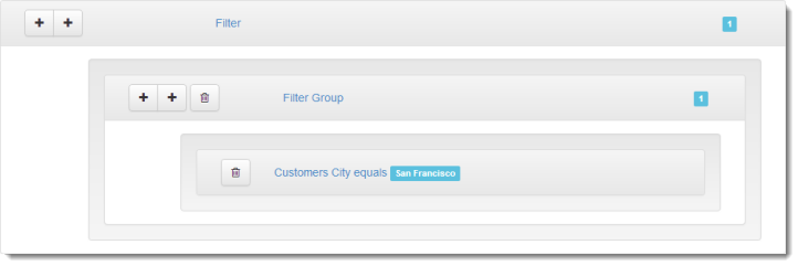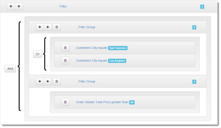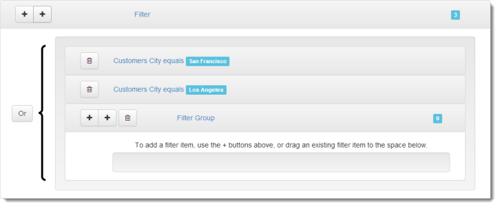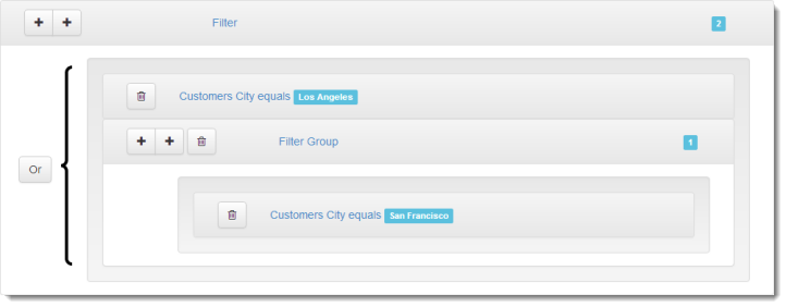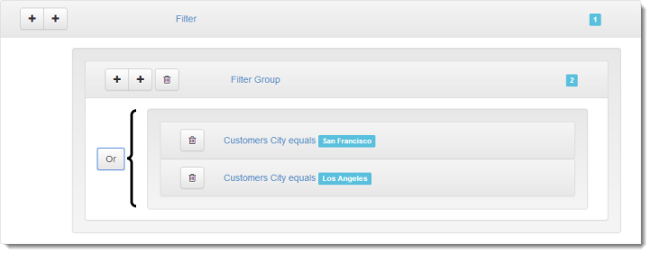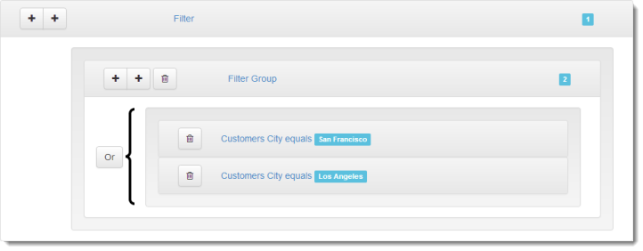 As discussed in the Creating a Filter topic, filter groups are used to group filter conditions that use the same operator. Filter groups are connected together using another connection. So, to get all customers from San Francisco or Los Angeles where the sales amount is more than $50, use one filter group of “City equals San Francisco” connected with OR to “City equals Los Angeles” and another filter group of “Sales is greater than 50.” The two groups are connected using AND.