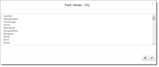 button. A list of unique values from the field appears in the Field Values dialog. You can choose a single value or multiple values; to select more than one value, hold down the Ctrl key as you click the desired values. If you choose more than one, the operator is automatically changed to is one of.