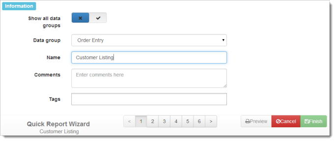 Data group: the module to report on. Only those modules installed on your system and you have rights to appear. This doesn’t appear if Show all data groups is turned on.