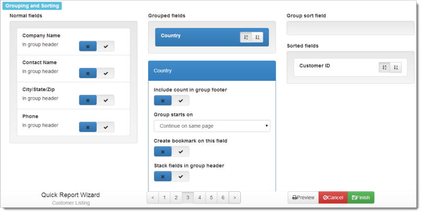 Grouping: this sorts the data in the report by the different values of the grouped field. For example, if the report shows invoices grouped by customer name, all of the invoices for each customer appear together. Groups have three sections: a group header which shows the current group value (such as the name of the customer), the detail lines for that group (for example, the invoices), and a group footer, which shows summary information for the group (such as the number of invoices and the total amount for that customer). The groups are sorted by the grouped field (for example, invoices for Alfreds Futterkiste come before those for Consolidated Holdings) unless there’s a group sort field.