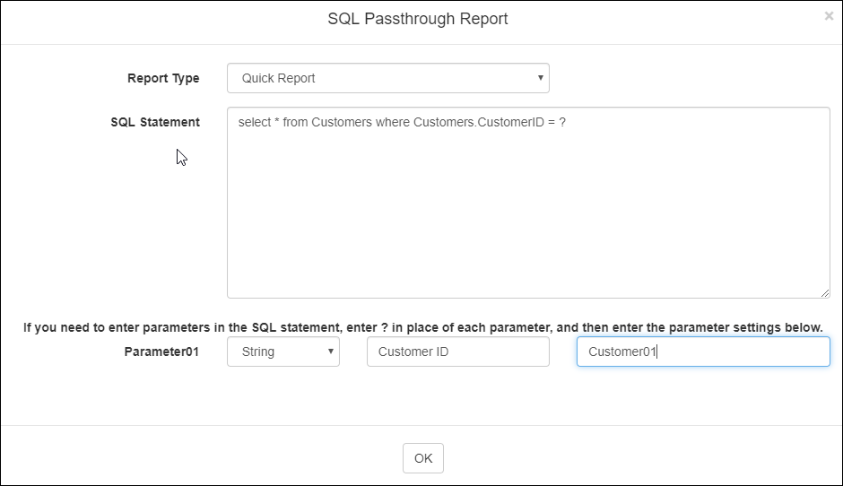 If you need to specify any parameters for the SQL statement, use a ? as the placeholder for the value. You can then specify a data type, caption, and value for the parameter in a list below the SQL statement.