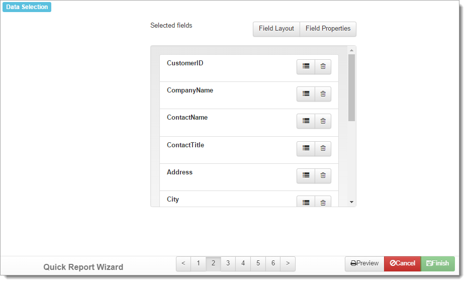 For a more in-depth discussion of the individual steps in the wizard, please see the appropriate help file topic (Quick Report, Cross-Tab Report, Label Report, or Chart Report).