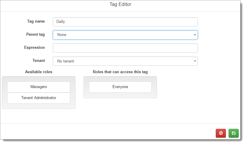 Tenant: this control, which only appears if you’re an administrative user, allows you to define which tenant the tag belongs to. Choose the desired tenant from the drop-down list or choose No tenant if the tag is available to all tenants.