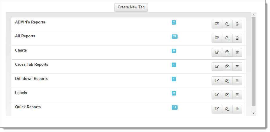 The list shows which tags have already been defined and buttons to edit, copy and delete them. There’s also a column of values that shows how many reports each tag has been assigned to. To add a tag, click the Create New Tag button. To edit the properties of a tag, click Edit button for the tag.