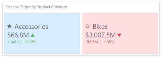 Cards allow you to visualize the difference between the actual and target values using special delta values and a delta indicator. If the default layout is used (Stretched layout type), the card displays the following delta values/elements: